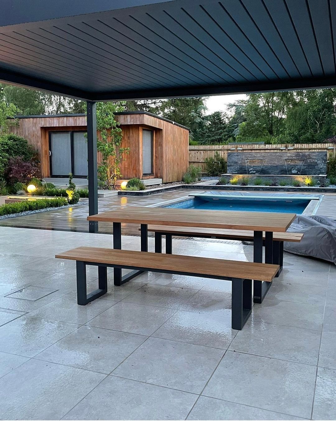 In a rain shower, the water is guided through integrated channels on the slats into the surrounding gutter and is drained by the supports. A pergola offers comprehensive and individual protection.